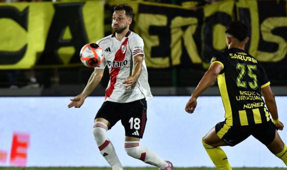 El partido comenzó con intensidad y situaciones repartidas. A los pocos minutos, River generó una llegada a través de un tiro de esquina, pero Peñarol respondió con la ocasión más clara del inicio: Abel Hernández quedó mano a mano tras una falla defensiva, aunque el arquero Franco Beltrán reaccionó con rapidez y evitó la apertura del marcador. Tras esa jugada, el delantero uruguayo sufrió una molestia y debió ser reemplazado a los 10 minutos por Facundo Batista.