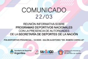 El próximo 22 de marzo a partir de las 18:00 hs, se llevará a cabo en el Salon Auditorio “Dr. Ramón Carrillo” del Polideportivo Provincial, una reunión informativa sobre los programas Deportivos Nacionales.