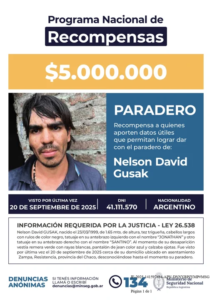 En la Resolución 30/2026, publicada en el Boletín Oficial, se informa que a comienzos de diciembre de 2025 la Fiscalía de Investigación Nº3 de Chaco, a cargo de Rosana Beatriz Soto, solicitó a la cartera de Seguridad que se ofrezca una recompensa para aquellas personas que, sin haber intervenido en los hechos delictuales, brinden datos útiles que permitan lograr dar con el paradero de Gusak.
