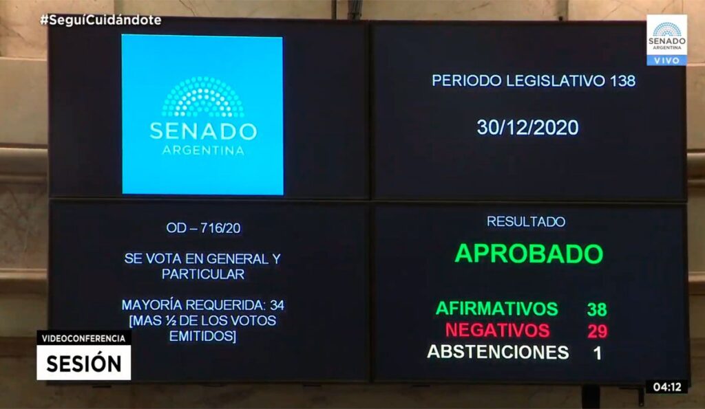 El proyecto Interrupción Voluntaria del Embarazo (IVE) fue convertido en ley, tras la aprobación de hoy en el Senado de la Nación, con 38 votos a favor, 29 votos en contra y 1 abstención y luego de una maratónica sesión que duró 24 horas.