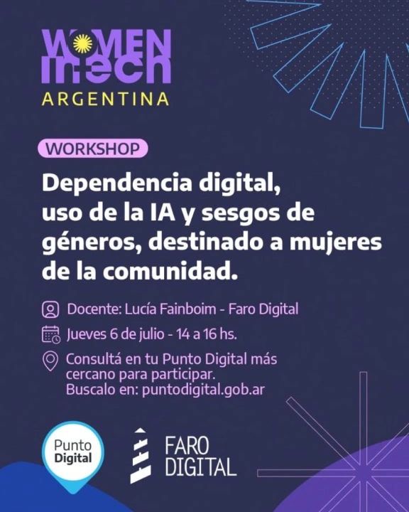 En ese sentido, detalló que desde el espacio de conocimiento y entretenimiento “Punto Digital” dictará un taller de “Dependencia Digital”, uso de las IA y sesgos de género destinados a mujeres de toda la comunidad.
