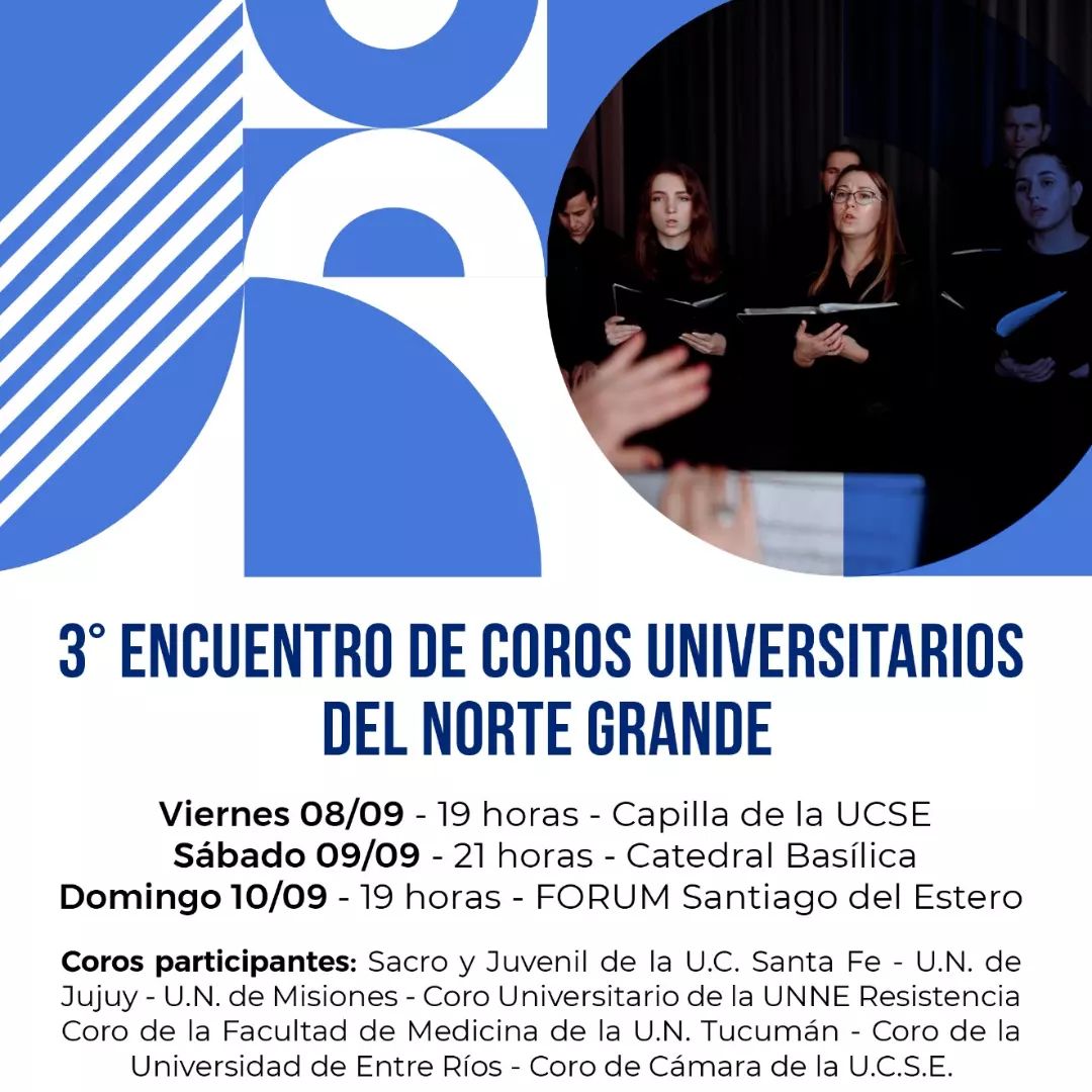La actividad iniciará el viernes 8 de septiembre a partir de las 19hs en la Capilla del Campus de la Ucse; continuará el sábado 9 donde los coros se trasladarán a la Iglesia Catedral de Santiago del Estero a partir de las 21hs y culminaría el día domingo 10 a las 19hs en el Forum.